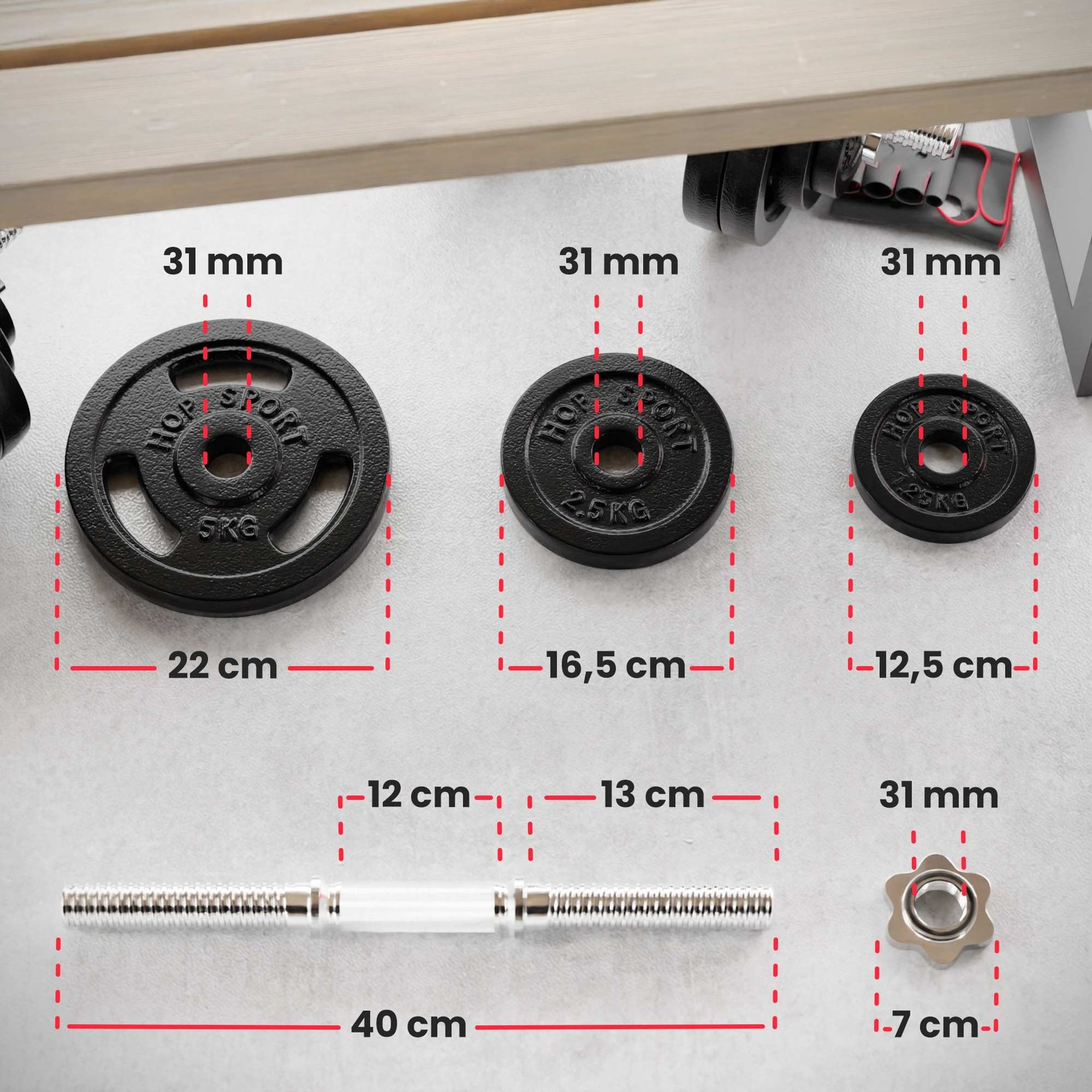 Una barra de acero cromado excepcionalmente resistente está equipada con una parte de agarre estriada, que aumenta la seguridad del ejercicio al prevenir el deslizamiento de las manos durante entrenamientos intensos. Los extremos roscados permiten una colocación rápida y sin problemas de los pesos con un orificio de diámetro de 31 mm , y los cierres especiales aseguran los discos de peso en la barra. Para aumentar aún más la seguridad de tu entrenamiento, hemos incluido en el conjunto guantes de neopreno en tamaño universal, que garantizan un agarre seguro y cómodo.