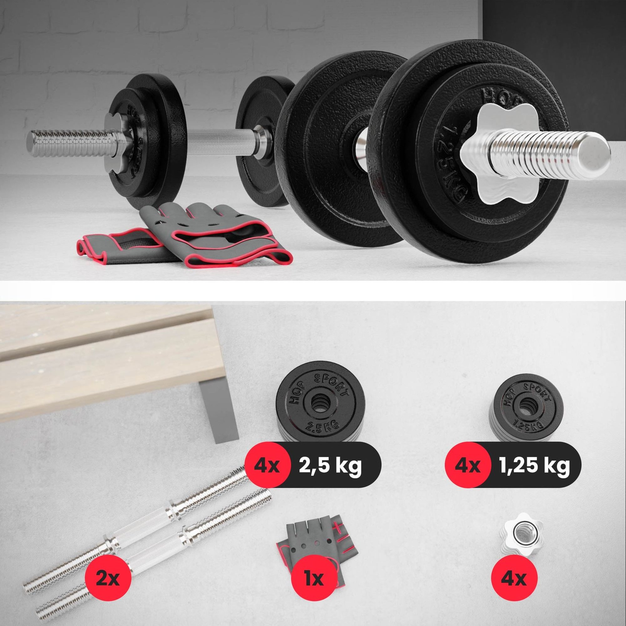 Pesas de hierro fundido 2x10kg, compuestas por discos y barra hechos de materiales de alta calidad, lo que constituye un conjunto duradero para ejercicios durante años.