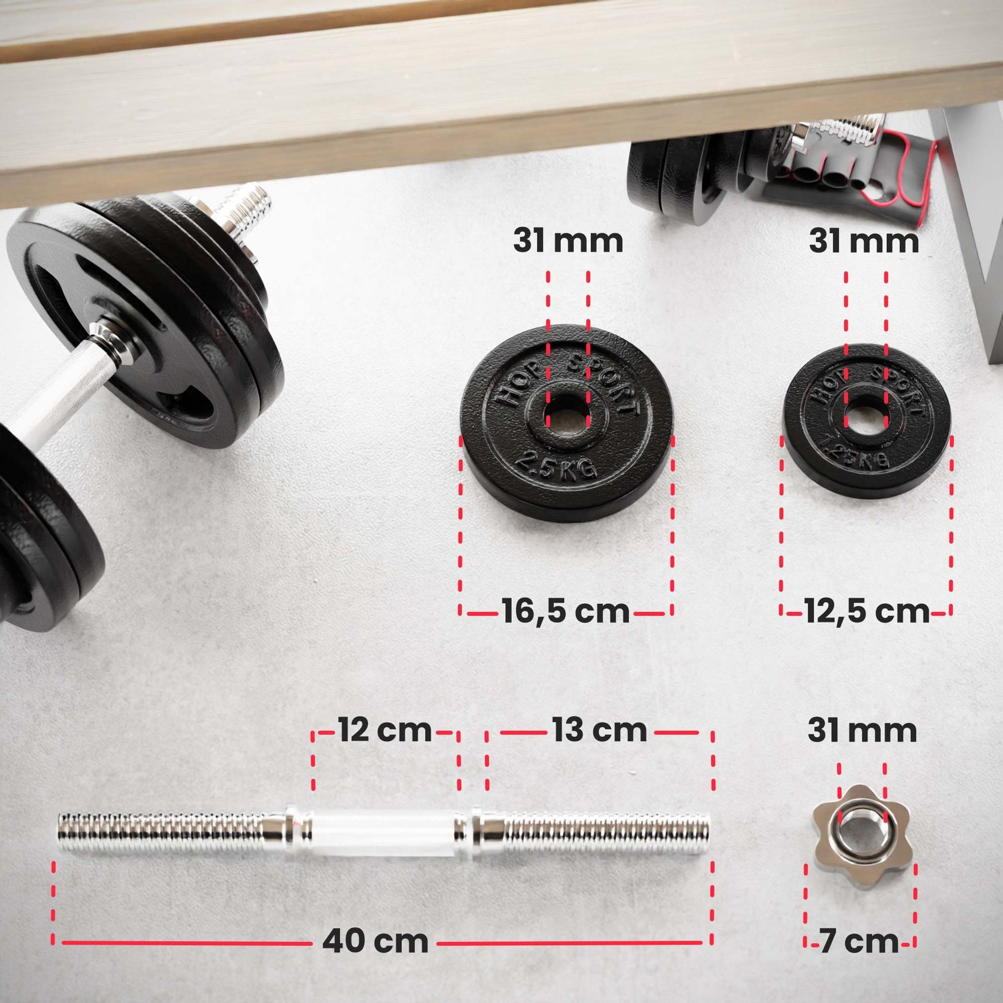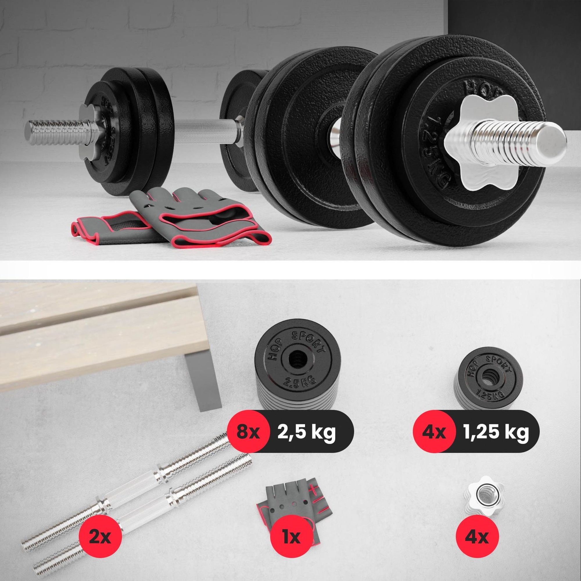El conjunto de mancuernas de hierro fundido incluye los siguientes componentes:
