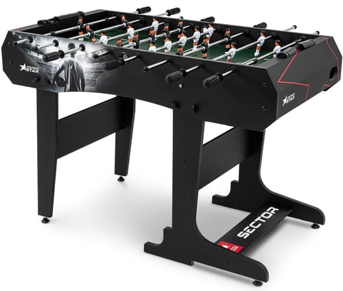 El futbolín Sector, gracias a su construcción, es ideal para juegos dinámicos. Las patas anchas de la mesa aumentan la estabilidad del futbolín. Las patas niveladoras colocadas debajo de las patas de la mesa permiten ajustar eficazmente la mesa al suelo. Existe la posibilidad de plegar la mesa para que no ocupe espacio durante los descansos.