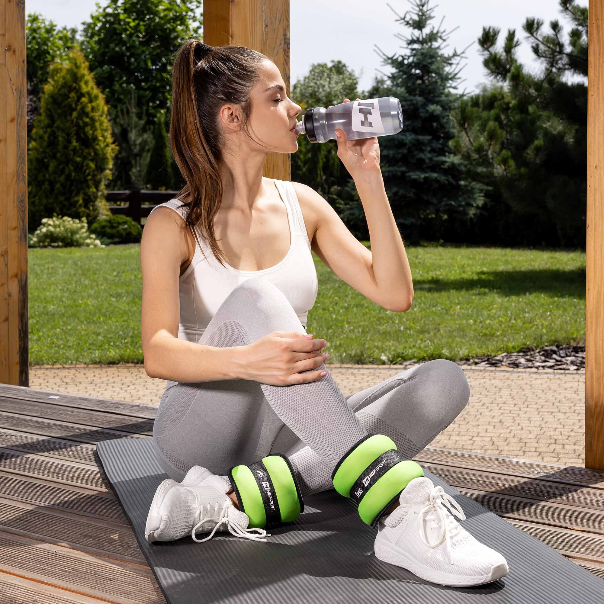 Juego de pesas para manos y tobillos 2x1kg en color verde. Cierre: ajustable con velcro, talla universal. Relleno de arena especial.