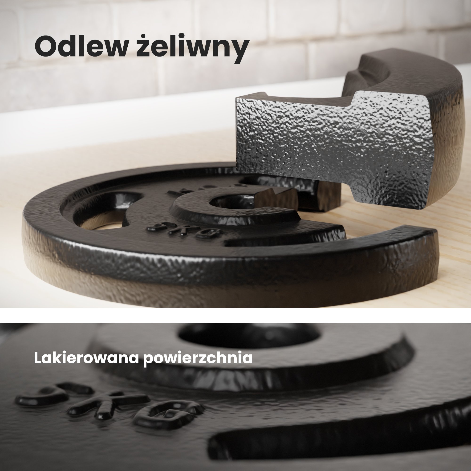 Pesas de hierro fundido de 5 kg, 10 kg, 15 kg y 20 kg están equipadas con agarres especiales en forma de volante . Te facilitarán la colocación del peso en el barra y su traslado. Los agarres también se pueden usar durante el entrenamiento con solo el peso – gracias a ellos puedes usar discos de hierro fundido como sustitutos, por ejemplo, de kettlebells. Las pesas, para mayor comodidad, también tienen marcas de peso legibles en forma de grabados.