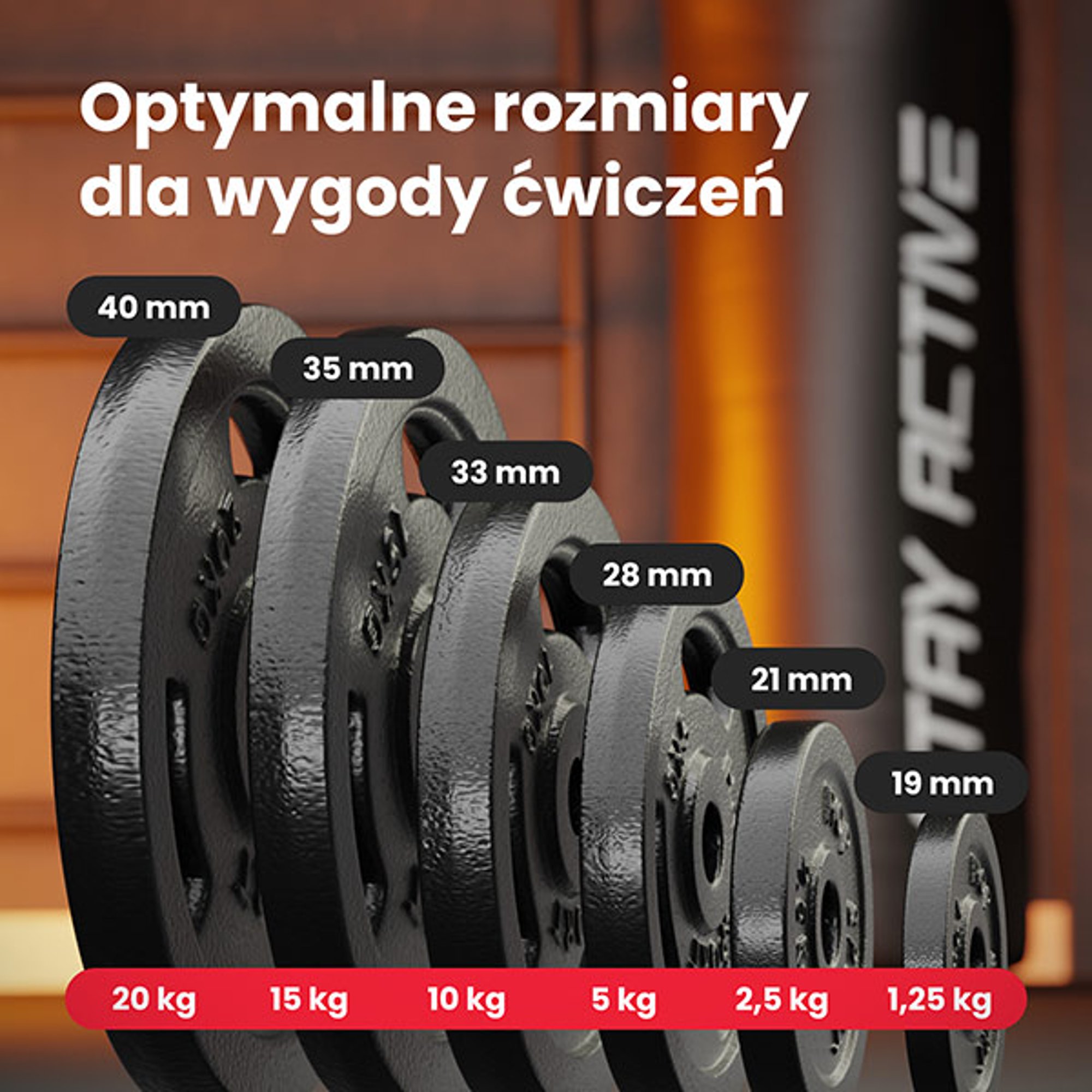 Pesas de hierro fundido 40kg (2x20kg) están destinadas a personas experimentadas y que valoran la más alta calidad y durabilidad por años. Están hechas de fundición de hierro completa, por lo que son extremadamente resistentes a daños y arañazos. Para una protección adicional, se han recubierto con una capa lacada que las protege de la corrosión. Pesas de hierro fundido están óptimamente adaptadas para el entrenamiento de fuerza: tienen un tamaño pequeño, lo que permite que se acomoden más en la barra. También tienen un agujero universal de diámetro 31 mm , que se adapta a la mayoría de las barras del mercado. Con nuestras pesas de hierro crearás el conjunto ideal para el entrenamiento de fuerza con barra. También puedes entrenar solo con los discos – te facilitarán esto los agarres cómodos, con los que están equipadas las pesas de 5 kg, 10 kg, 15 kg y 20 kg.