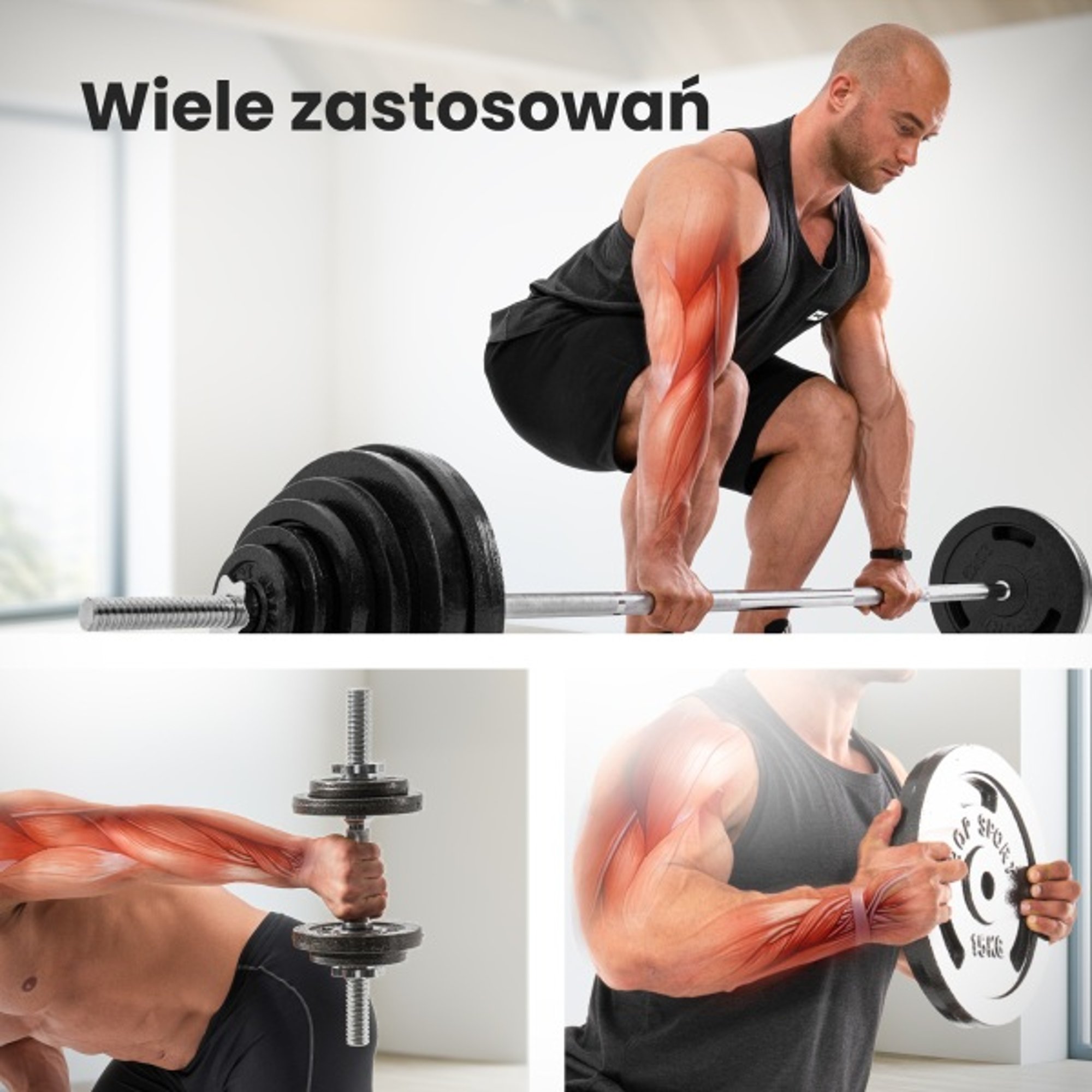 Al elegir pesas de hierro fundido tienes varias posibilidades de uso. Puedes colocarlas en la barra de la barra o mancuernas y realizar entrenamiento con pesas libres. Sin embargo, nada te impide usar solo los pesos para realizar ejercicios como elevaciones, aperturas o sentadillas.