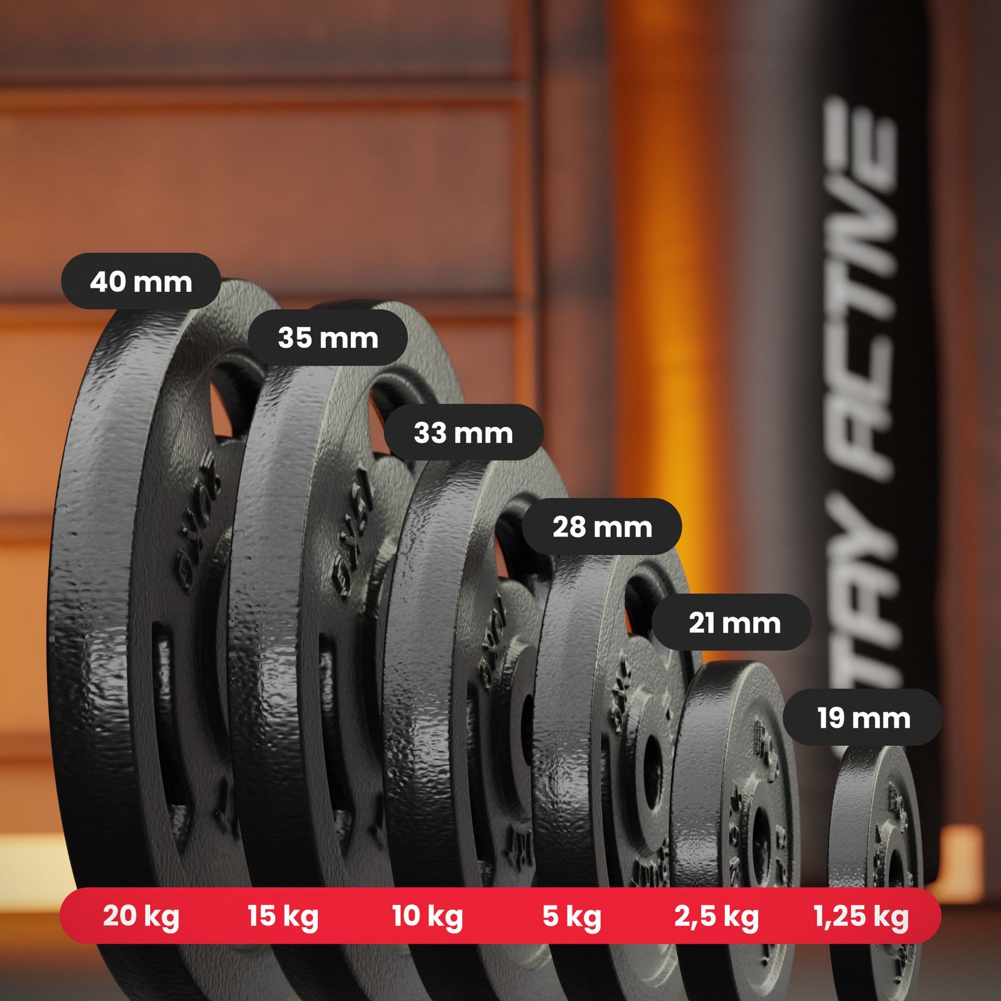 Los discos de hierro fundido tienen un agujero universal de 31 mm de diámetro . Se adapta a la mayoría de las barras estándar con un diámetro de 30 mm.