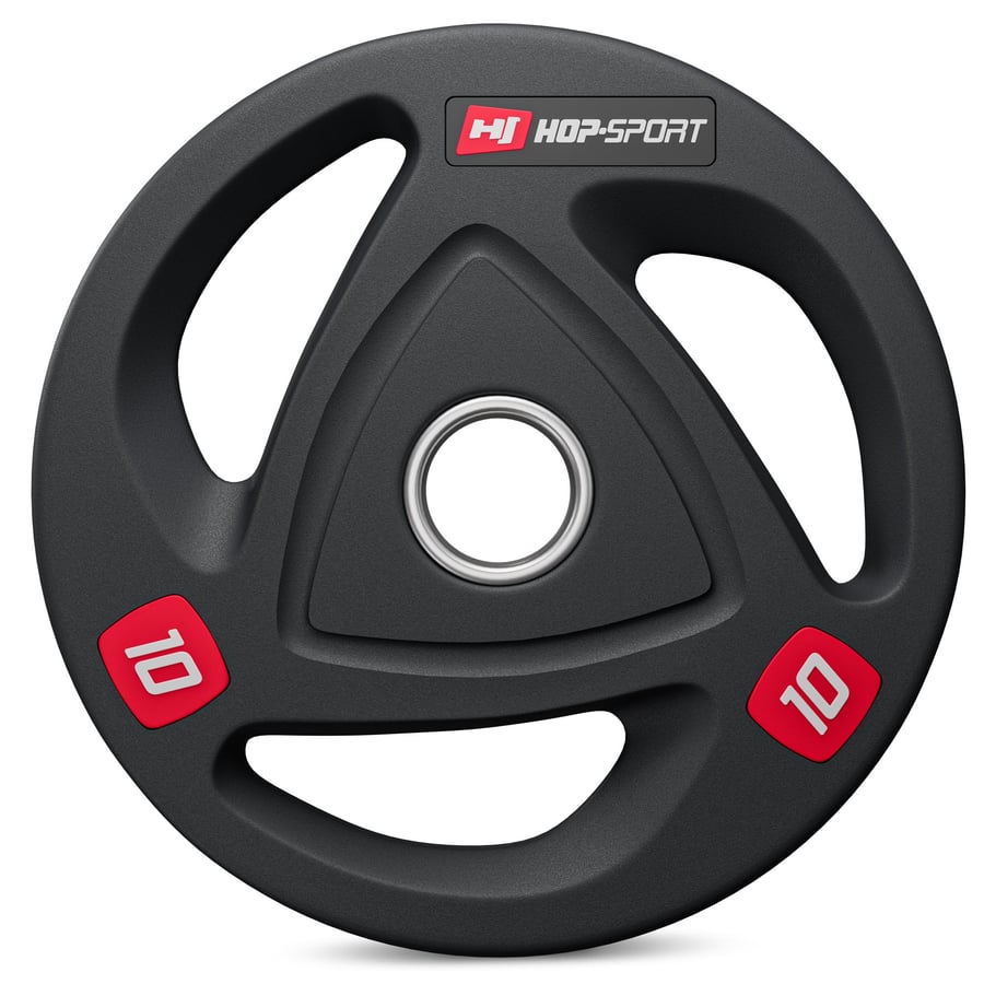 Obciążenia olimpijskie 10 kg wykonano z pełnego odlewu żeliwnego, pokrytego antypoślizgową gumą , która skutecznie amortyzuje ciężary w przypadku ich upuszczenia. Stalowy pierścień o średnicy 51 mm gwarantuje wysoką wytrzymałość talerzy olimpijskich przy ich częstej wymianie na gryfie. Ciężary olimpijskie 10 kg posiadają tłoczenia z informacją o wadze, które ułatwiają szybką identyfikację i zmianę obciążenia. Specjalne uchwyty pozwalają na wygodne zakładanie talerzy na gryf, a także ich przenoszenie, jak również pozwalają na szersze wykorzystanie obciążeń w codziennym treningu , np. jako zamiennik kettlebell.