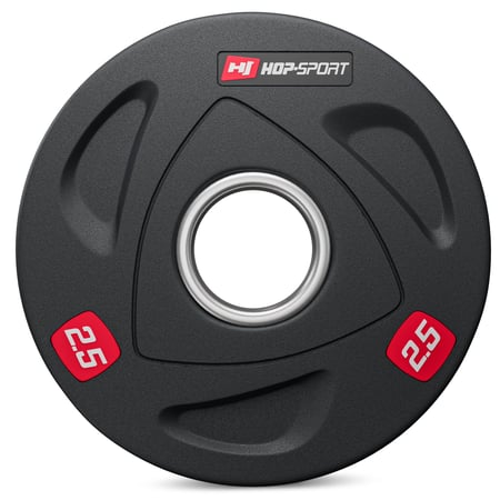 Pesas olímpicas de 2,5 kg hechas de fundición de hierro completo, cubiertas con goma antideslizante , que efectivamente amortigua los pesos en caso de caída y adicionalmente reduce el ruido generado. El anillo de acero con un diámetro de 51 mm garantiza una alta durabilidad de los discos olímpicos durante su frecuente cambio en la barra. Las pesas olímpicas de 2,5 kg tienen grabados con información sobre el peso, que facilitan la rápida identificación y el cambio de peso, así como ranuras especiales, que actúan como asas , mejorando la comodidad de uso.