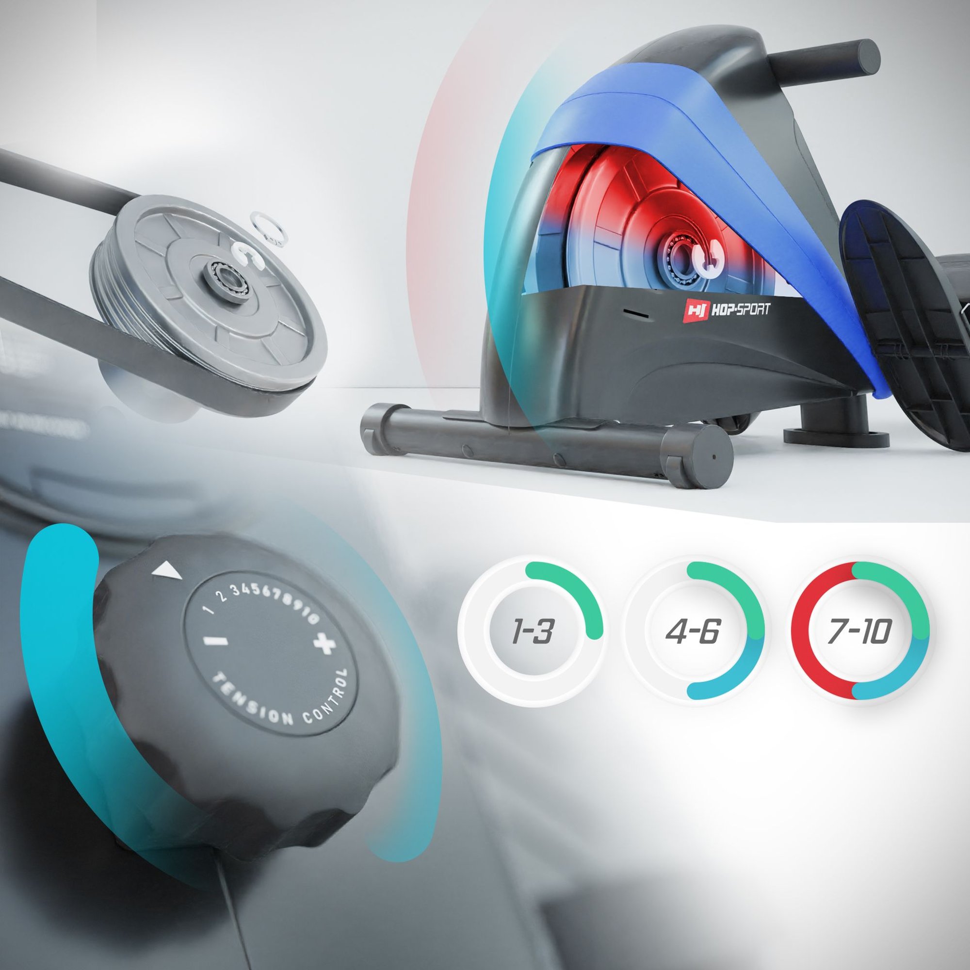 La intensidad del ejercicio se regula manualmente mediante un tornillo de bloqueo, situado al alcance del usuario. Un amplio rango de ajuste de resistencia de 10 niveles permite adaptar el nivel de dificultad del entrenamiento a las preferencias y objetivos individuales de entrenamiento. El peso del sistema de resistencia magnética de 9 kg garantiza un funcionamiento suave del dispositivo.