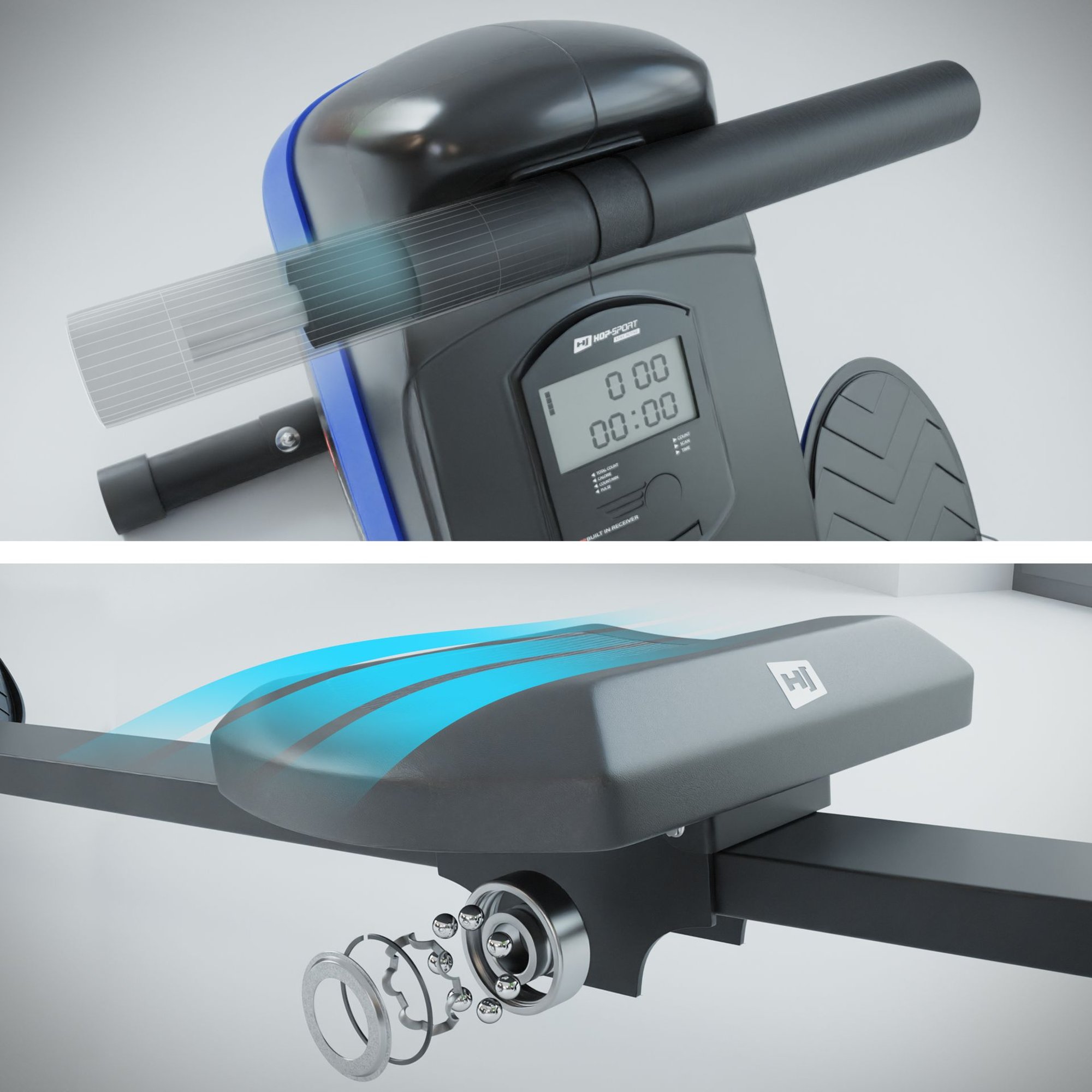 Ya no tienes que cargar el equipo para guardarlo después del entrenamiento. Gracias a las ruedas de transporte funcionales, puedes mover y guardar el remo cómodamente , para que no ocupe espacio en tu sala de estar. El sistema de plegado rápido del remo permite plegar el dispositivo fácilmente, ahorrando así espacio en la habitación.