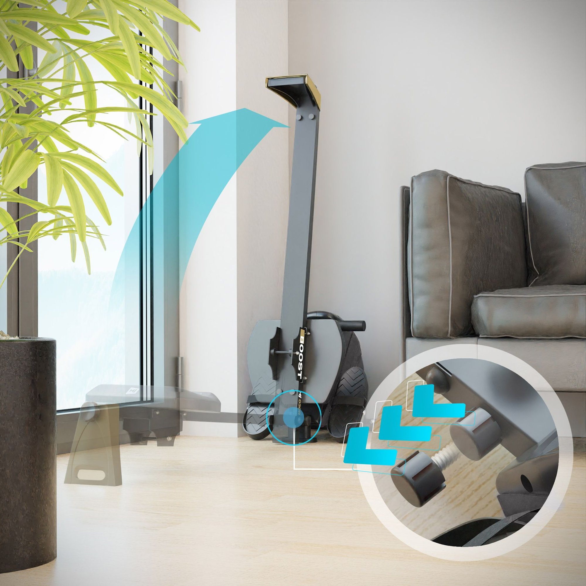en el remo permite plegar el dispositivo fácilmente, ahorrando así espacio en la habitación.