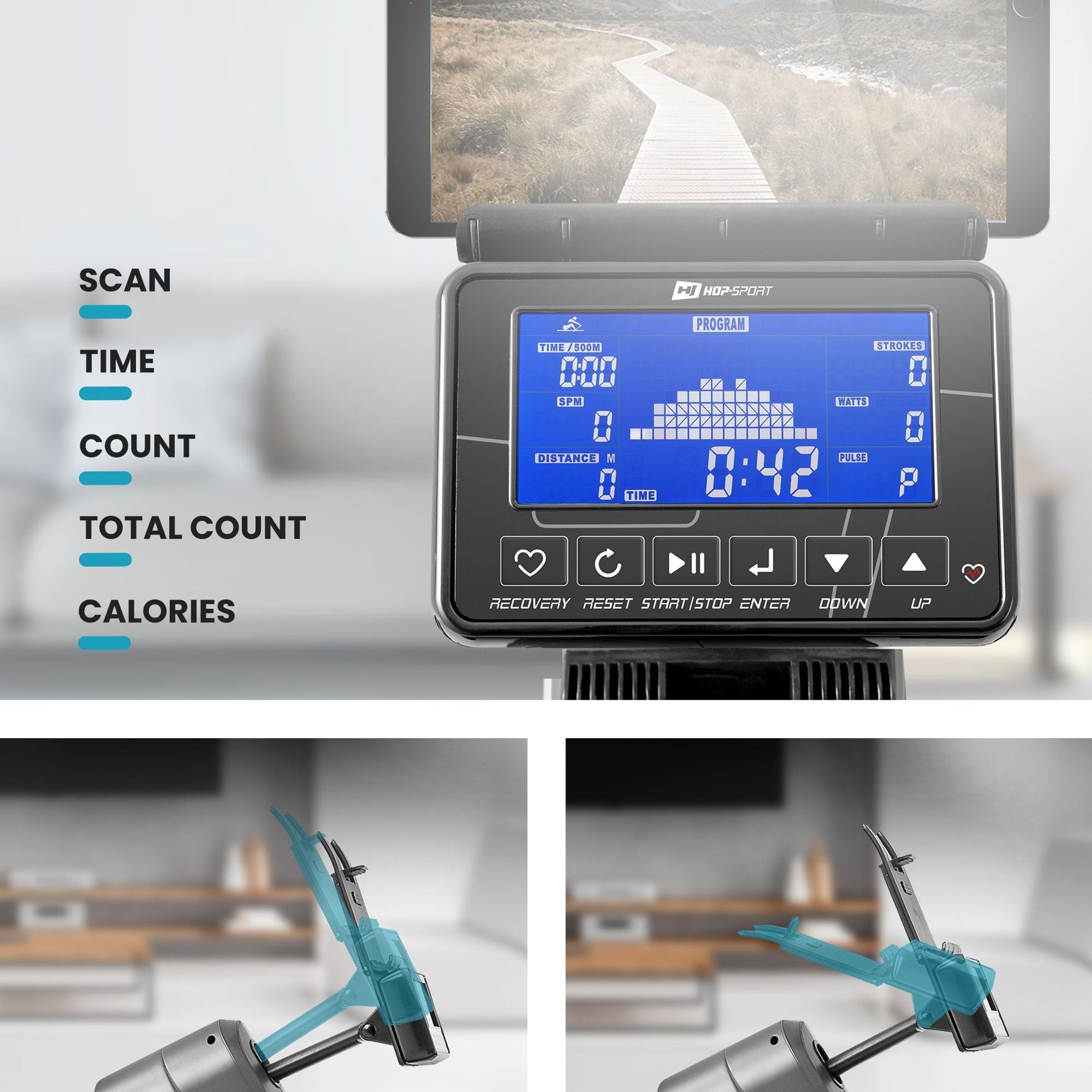 (incluido el modo de competición) y la función Recovery, que te permite verificar la capacidad de tu cuerpo. La almohadilla incorporada para tablet te permite usar cómodamente tu dispositivo móvil durante el ejercicio. Gracias a la regulación del ángulo de inclinación de la computadora, puedes ajustar su configuración según tus necesidades. Además, la computadora permite medir el pulso mediante una