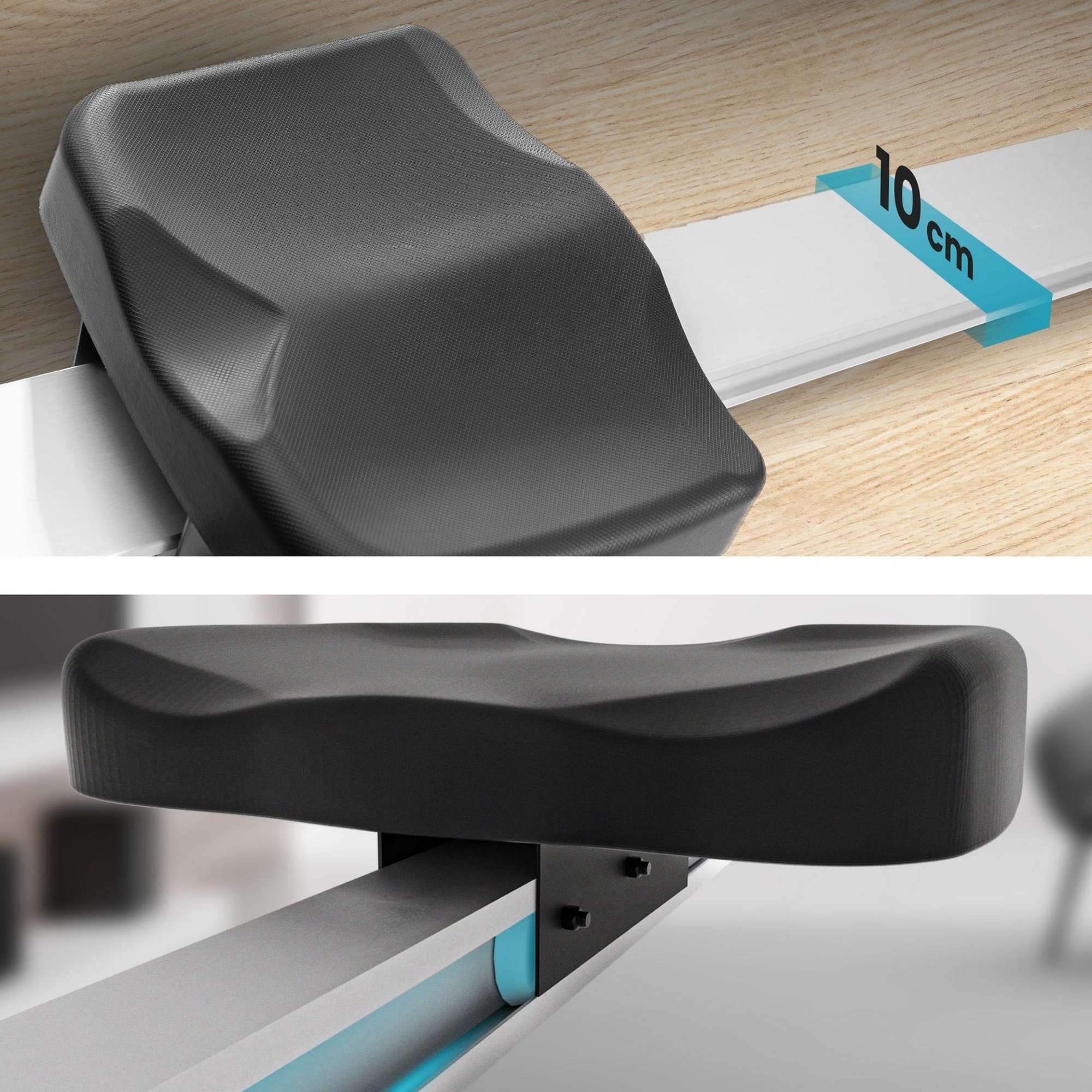 El asiento suave, anatómicamente diseñado, proporciona comodidad incluso durante los ejercicios más intensos, y sus dimensiones óptimas permiten adoptar una posición estable mientras remas. Las ruedas con rodamientos aseguran un movimiento suave del asiento a lo largo de la guía.