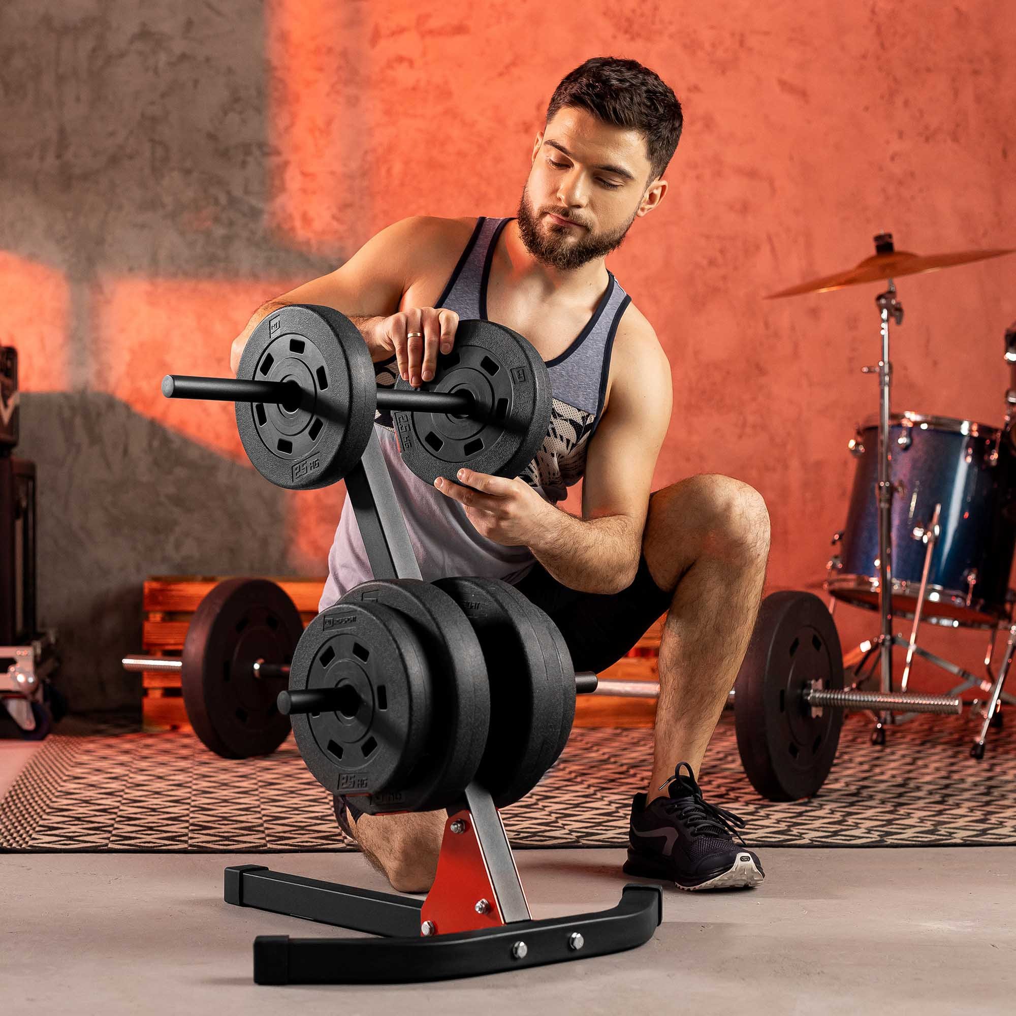 El soporte está equipado con cuatro barras para pesas, que tienen 20 cm de longitud y 25 mm de diámetro. Las barras están colocadas a ambos lados del soporte, lo que te proporciona un acceso conveniente a las pesas almacenadas.