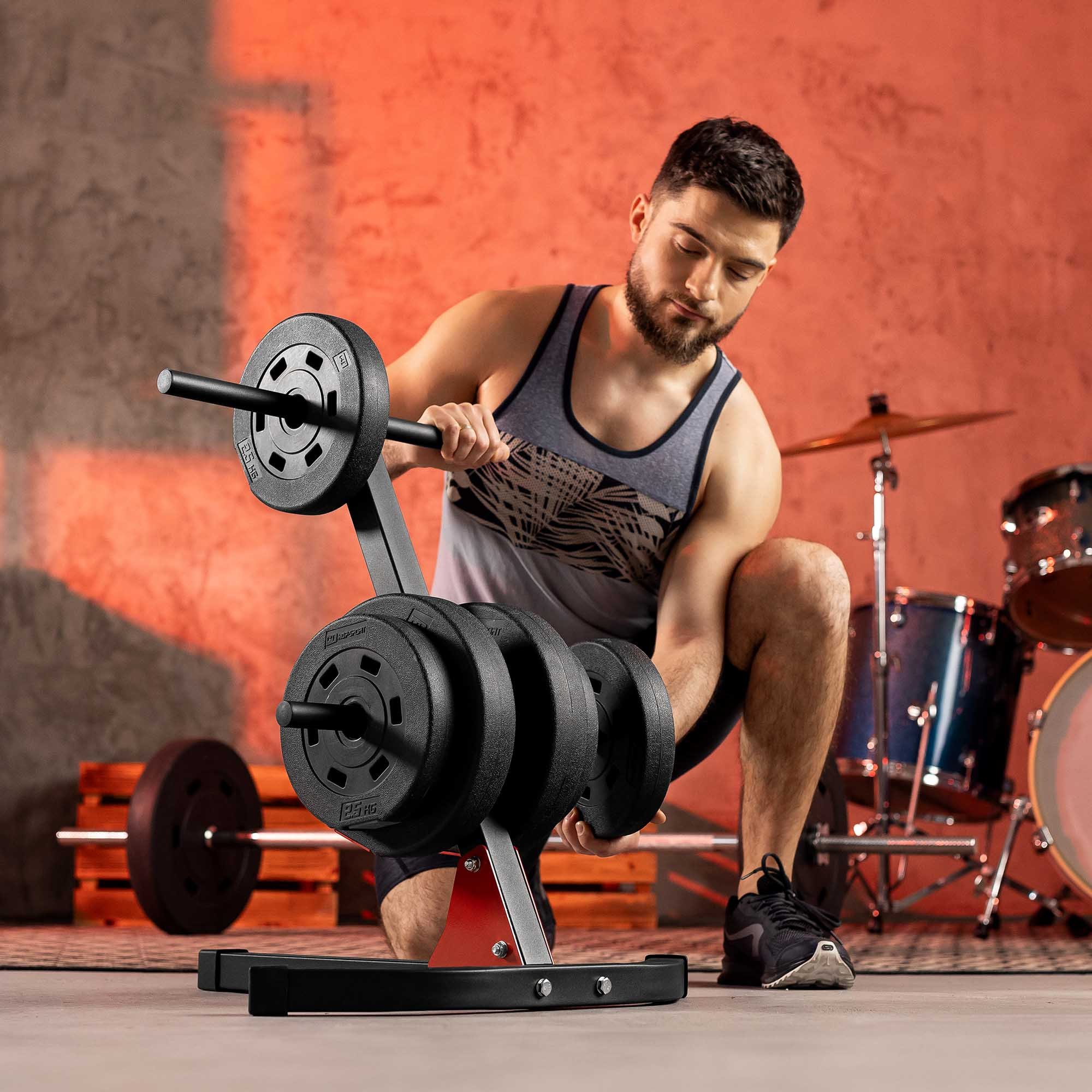 Soporte para pesas HS-1005A con capacidad de hasta 200 kg, con pasadores adicionales para pesas que realmente mejoran la comodidad del entrenamiento, incluye compartimento para barra