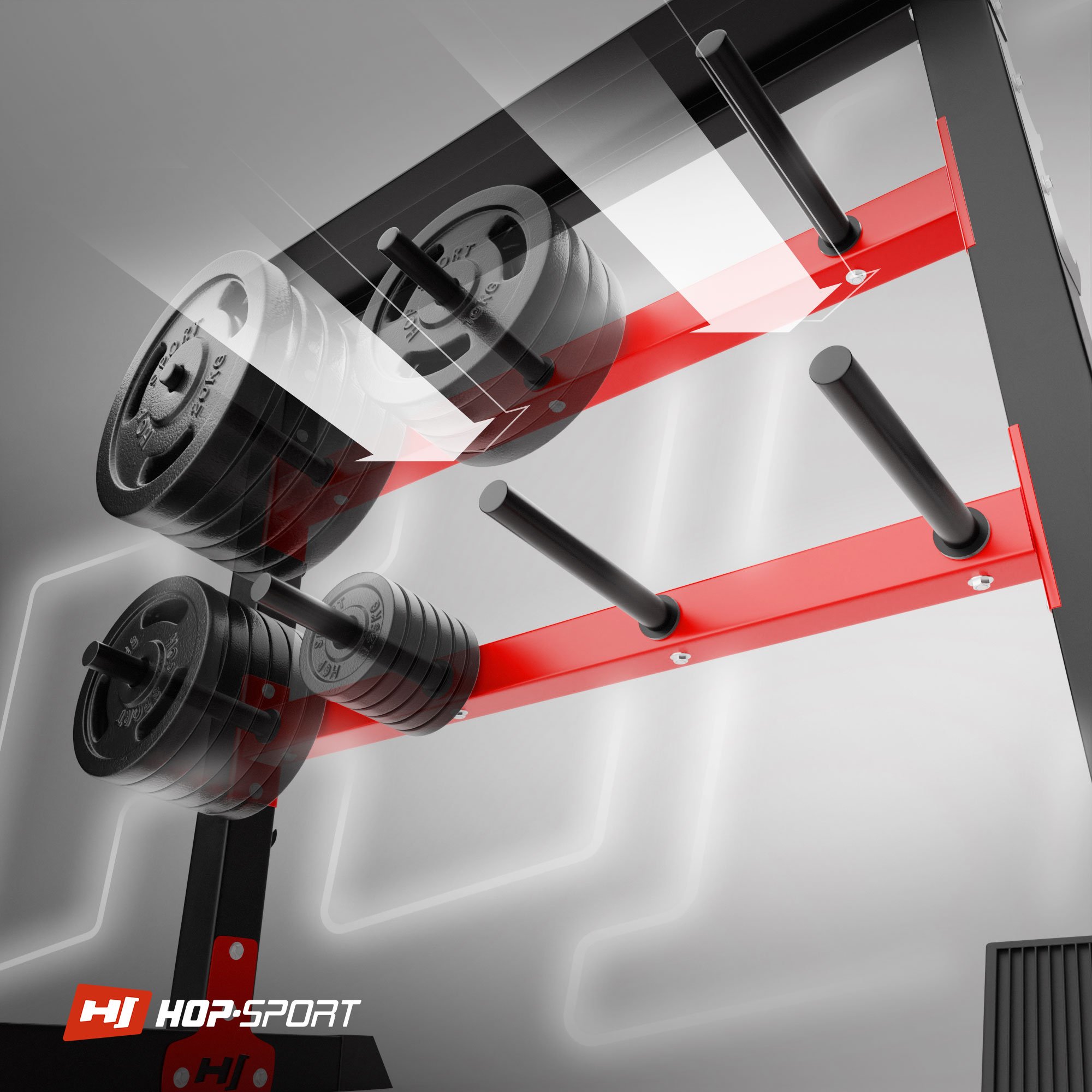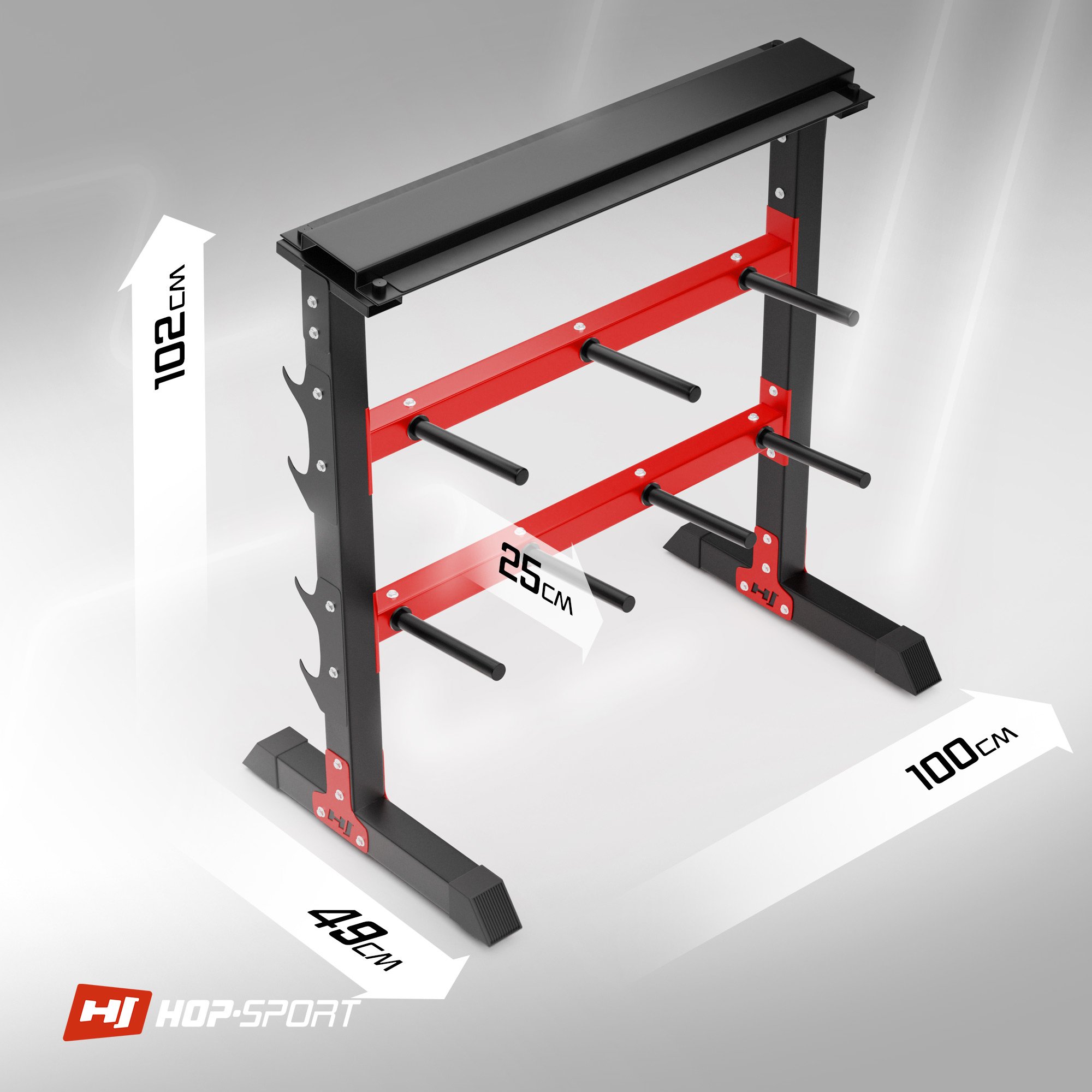 Cuanto más grande es la colección en el gimnasio en casa, más difícil es almacenarla y mantenerla ordenada. ¿Te preguntas qué soporte para equipo de fuerza elegir? Tenemos una propuesta para ti: el soporte HS-1007A de la marca Hop-Sport está diseñado para almacenar barras, mancuernas y pesas en un solo lugar. Tienes a tu disposición estantes, espigas y ganchos. Gracias al uso de acero de alta calidad, la estructura del soporte permite en un espacio reducido almacenar pesas de hasta 350 kg!