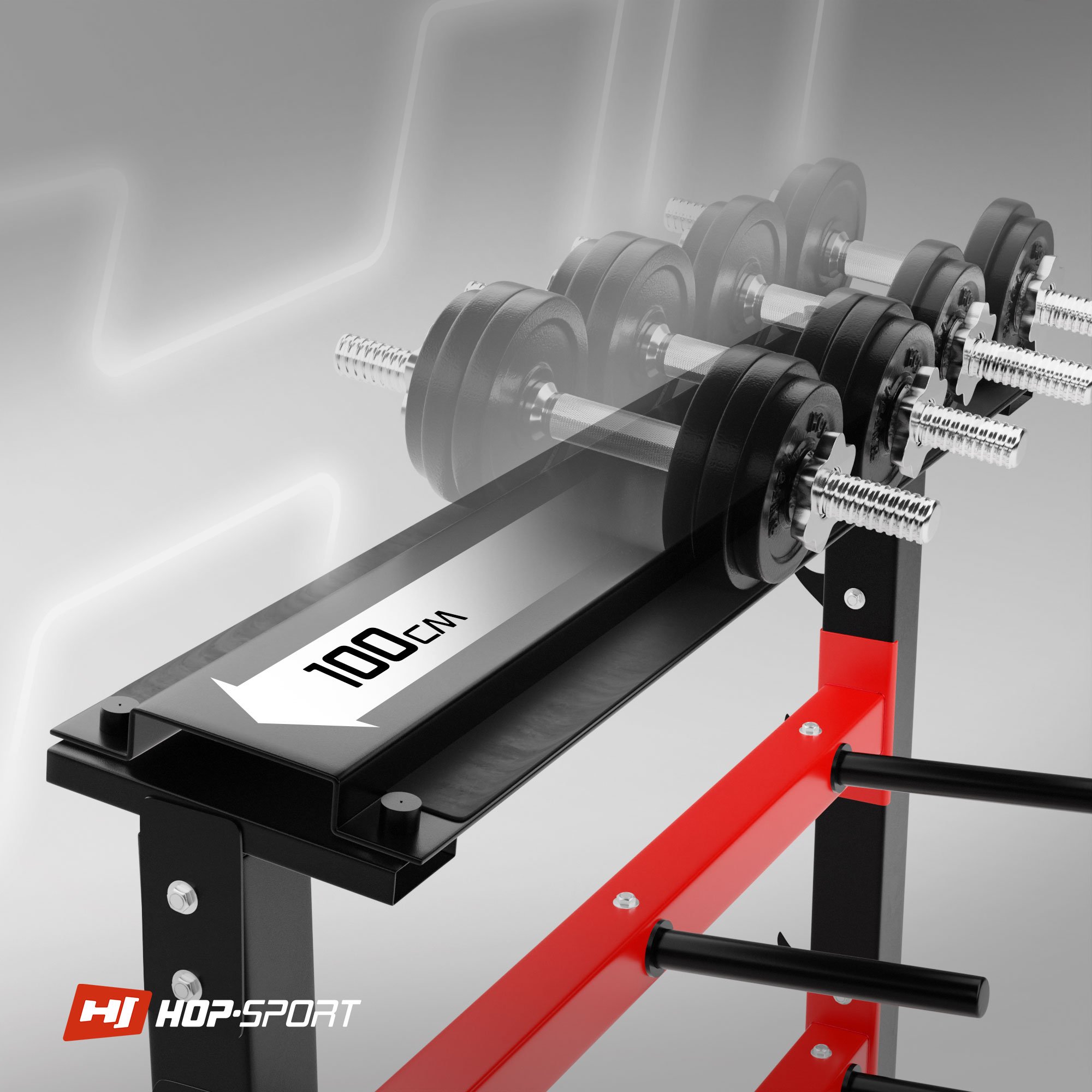 En la parte superior del soporte HS-1007A hay un estante práctico para mancuernas de 100 cm de longitud. El estante está equipado con almohadillas antideslizantes especiales y protecciones que evitan que las mancuernas se deslicen accidentalmente.