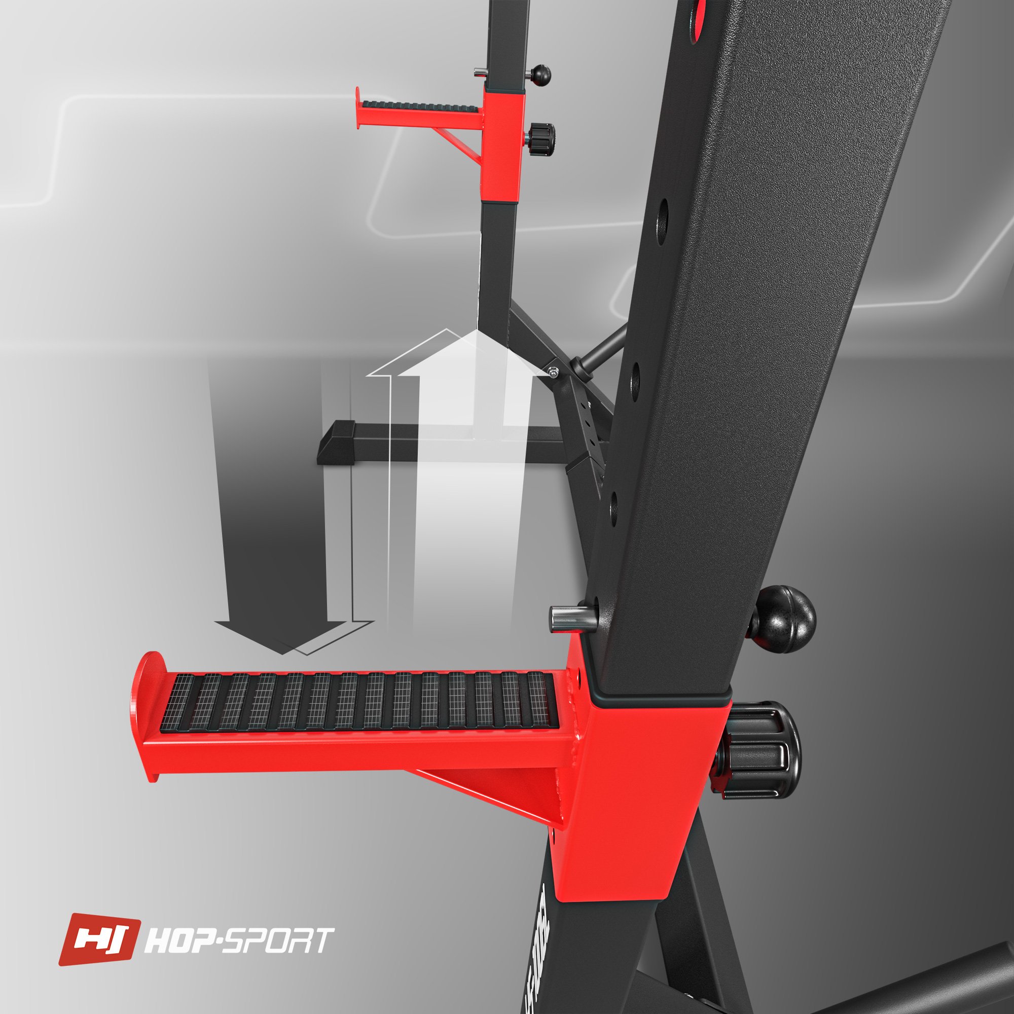 Los soportes HS-1006L tienen ganchos de seguridad que afectan el confort y la seguridad durante el entrenamiento. Gracias a ellos, puedes soltar la barra de manera segura cuando no puedas completar el movimiento completo durante el press. La altura de los ganchos de seguridad se puede ajustar a diferentes niveles, su altura depende del ajuste de la altura de los propios soportes. La carga máxima de los ganchos es de 200 kg. Las almohadillas de goma especiales en los ganchos amortiguan y reducen los sonidos no deseados al dejar la barra.