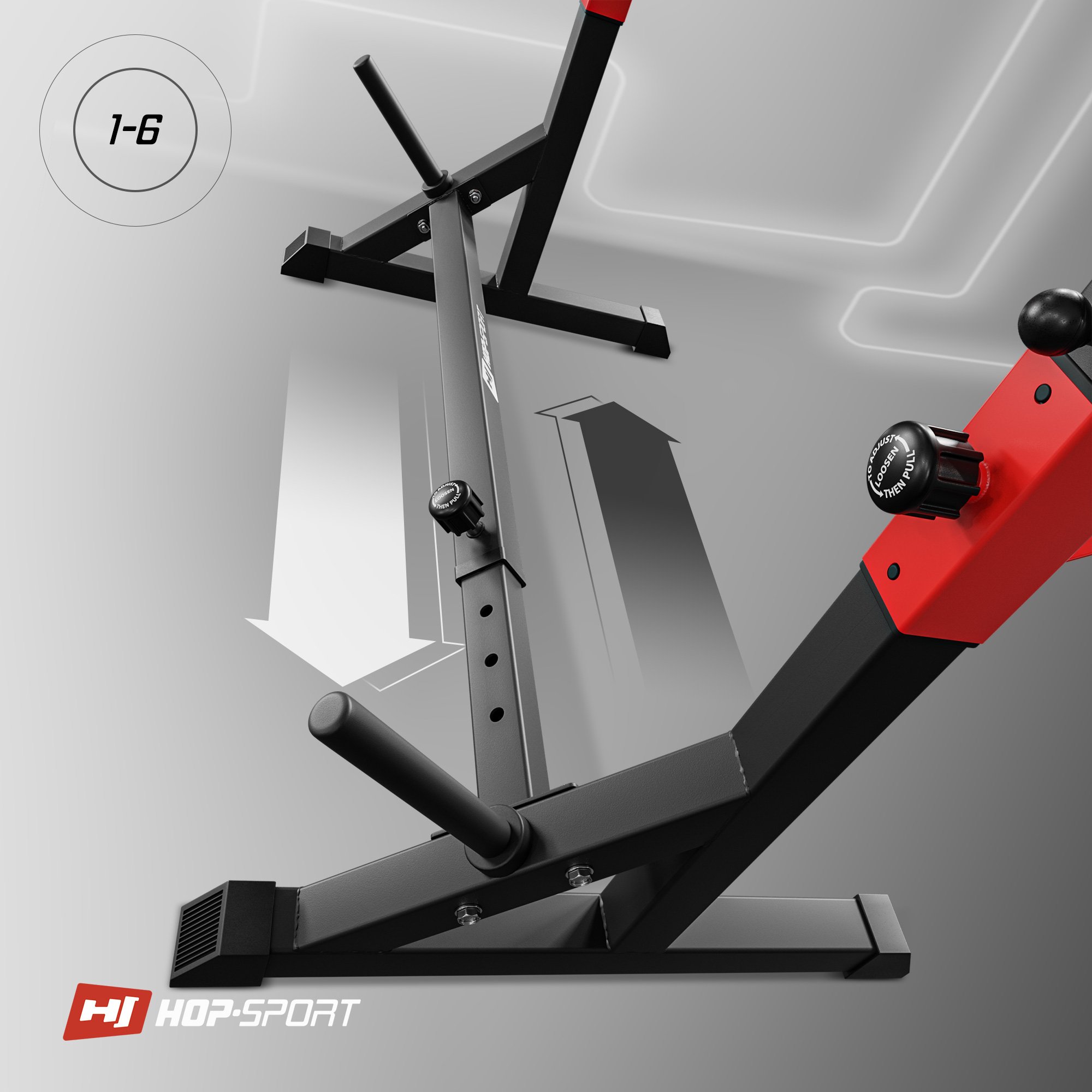 Un criterio importante para elegir soportes es la posibilidad de ajustar el ancho. En el modelo HS-1006L tienes la posibilidad de un ajuste de ancho de 6 niveles en el rango de 85 a 111 cm. Puedes entrenar con muchos tipos de barras, ajustar el ancho para ejercicios con banco o sentadillas con barra.